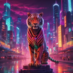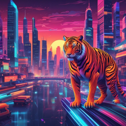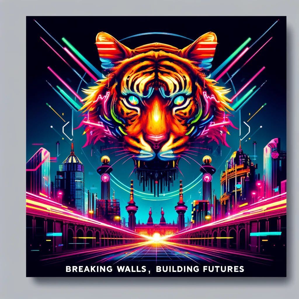 Our lovely cover artwork featuring a neon tiger above a futuristic city scape.